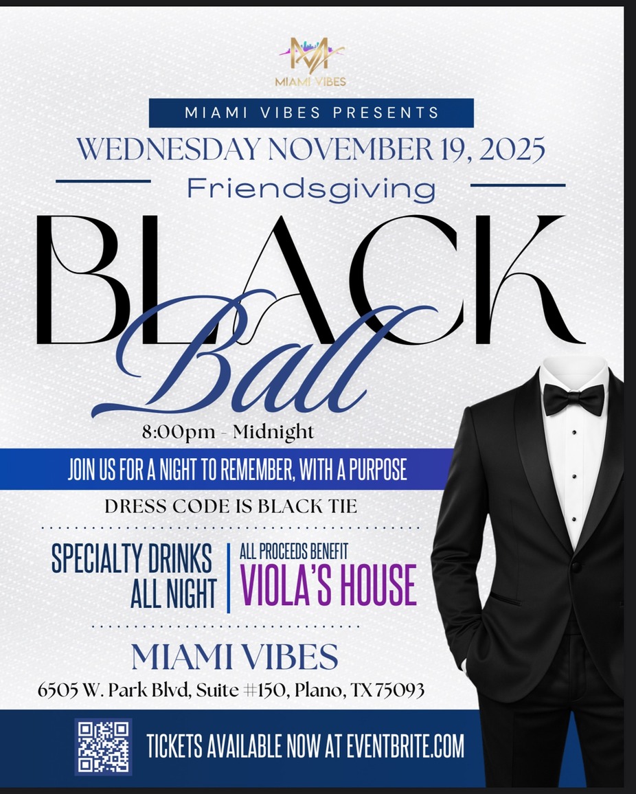 A night to remember with a purpose Join us Wed, Nov. 19 at Miami Vibes Plano for an elegant evening of culture, community, and connection — all benefiting Viola’s House, supporting young mothers in Dallas. Dinner | Live DJ | Black Tie vibes 8400 Preston Rd, Suite 150, Plano, TX 7PM–12AM | Dinner at 8PM https://miamivibesandviolashouse.eventbrite.com/